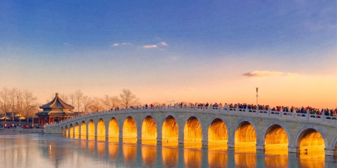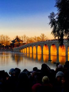 日落时分,借着落日余晖,北京颐和园十七孔桥附近呈现稍纵即逝的“金光穿洞”美景。