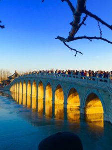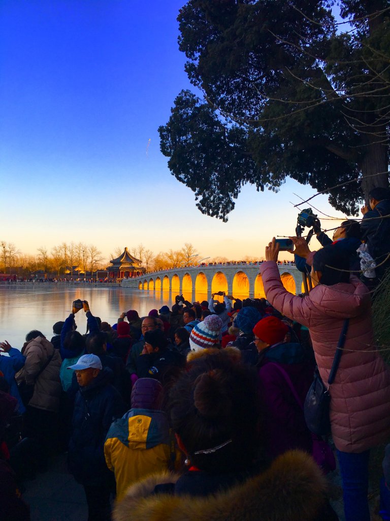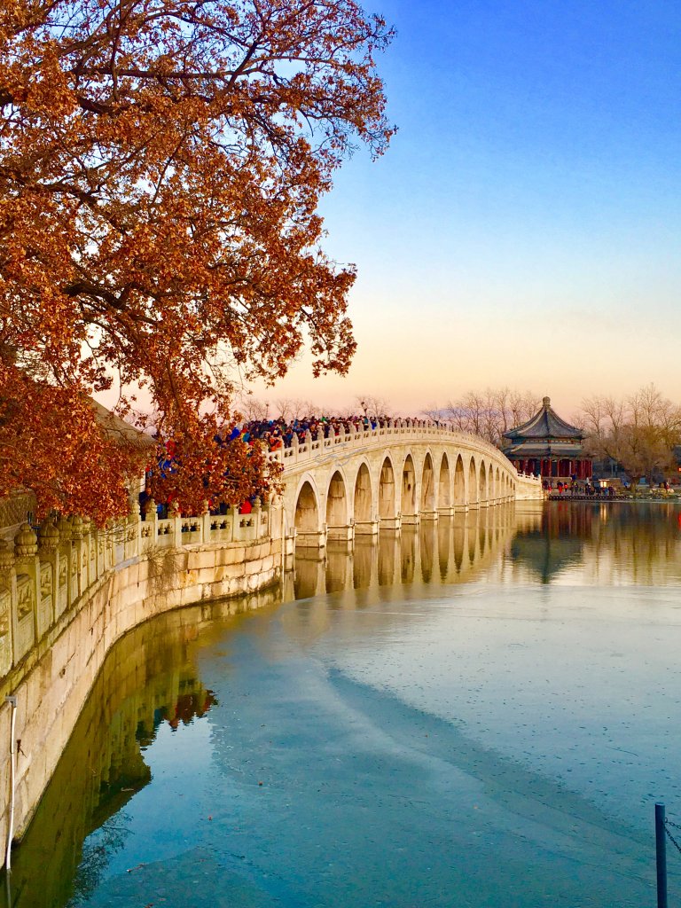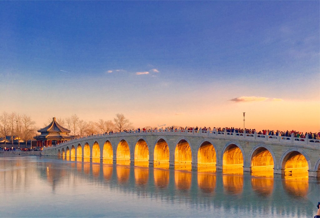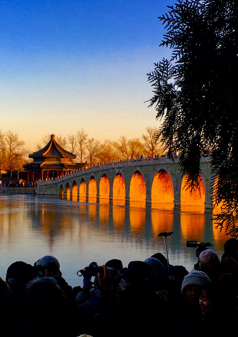 据说当年【颐和园】十七孔桥的建造者精心设计,将南回归线的落日与十七孔桥成垂直状态,因此当夕阳西下时,阳光最大程度的洒满十七孔桥的每个桥洞,并出现金光穿洞的奇特景观